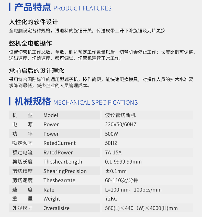 本機專門為汽車線束行業(yè)的波紋管開發(fā)設計,高精度PLC控制,操作簡單易懂,全自動電腦切管機,可用于圓形塑料軟管,波紋管的裁切,加工效率,穩(wěn)定可靠,采用步進電機送料,具有送料穩(wěn)定、長度精確的特點。
